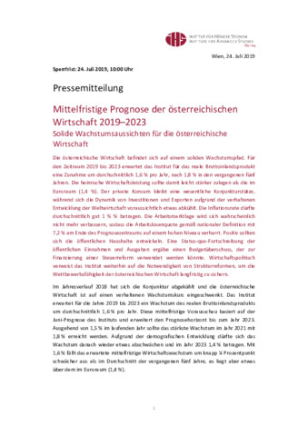 Mittelfristige Prognose der österreichischen Wirtschaft 2019-2023: Solide Wachstumsaussichten für die österreichische Wirtschaft.