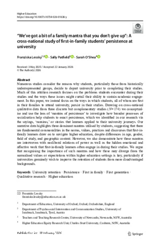 Numerous studies consider the reasons why students, particularly those from historically underrepresented groups, decide to depart university prior to completing their studies. Much of this attrition research focuses on the problems students encounter during their studies and the ways these issues might curtail their ability to sustain academic engagement. In this paper, we instead focus on the ways in which students, all of whom are first in their families to attend university, persist in their studies. Drawing on cross-national qualitative data from three discrete but complementary studies (N = 174) we conceptualise and use the lens of ‘mantras of persistence’ to investigate how broader processes of socialisation help students to enact persistence, which we identified in our research via the sayings, ‘maxims,’ or stories that learners applied to their university journeys. Our narrative data highlights three dominant mantras utilised by students, suggesting that there are fundamental commonalities in the norms, values, practices and discourses that first-in-family learners draw on to navigate higher education, despite differences in age, gender, field of study, and geographic context. However, we also demonstrate how these mantras are interwoven with neoliberal relations of power as well as the hidden emotional and affective work that first-in-family learners often engage in during their studies. We argue that recognising the importance of such mantras and how these may diverge from the normalised values or expectations within higher education settings is key, particularly if universities genuinely wish to improve the retention of students from more disadvantaged backgrounds.